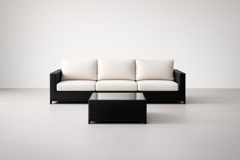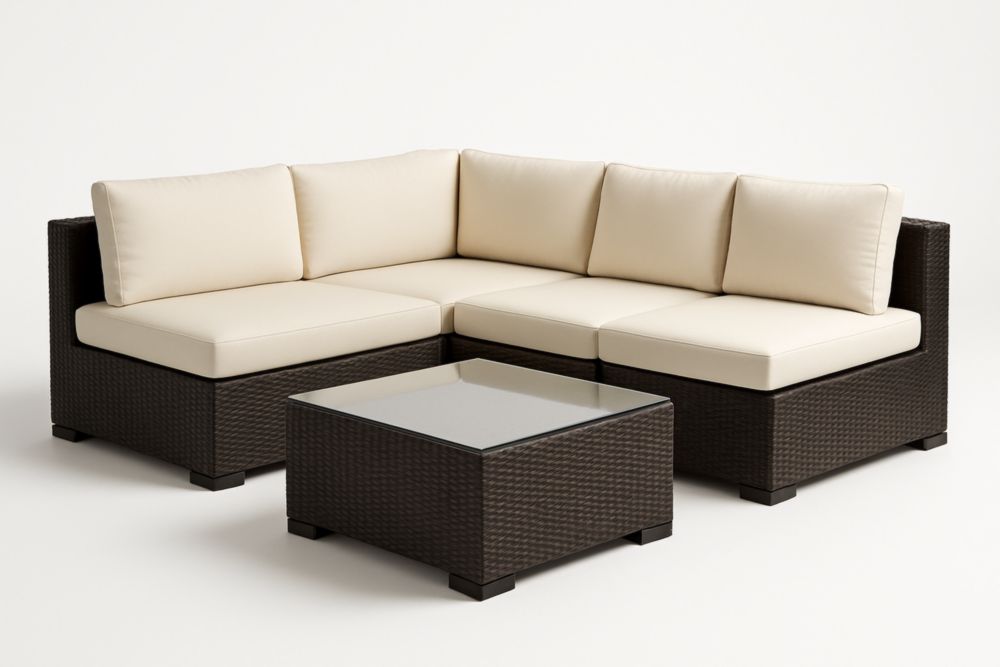 Matériaux : Résine tressée, verre trempé 5mm pour le plateau, coussins en tissu polyester