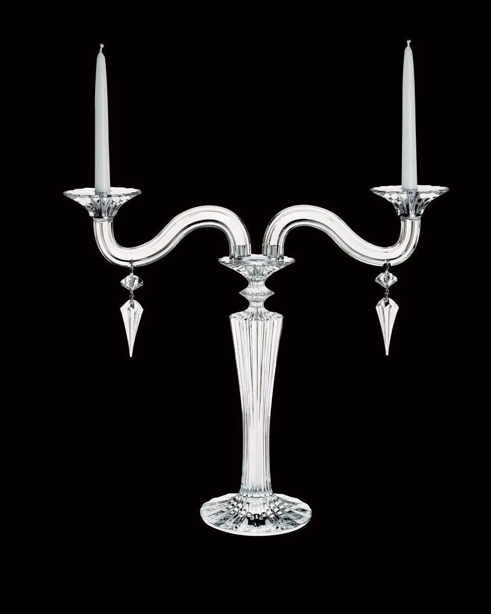 Le candélabre Mille Nuits présente un design inspiré par l'Orient. Les bras biseautés, décorés de tourbillons en cristal, créent un effet lumineux distinctif. Chaque bras est agrémenté de cristaux suspendus qui attirent la lumière. Les bougies reposent dans des bougeoirs en forme de jonquilles. Disponible en plusieurs versions lumineuses, il est également offert en finition or. Conçu par Mathias pour Baccarat, Mille Nuits évoque les 1001 Contes des Nuits. La collection inclut aussi des lustres et des décorations d'intérieur.